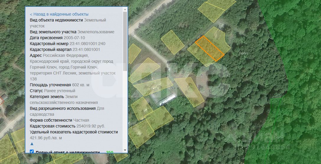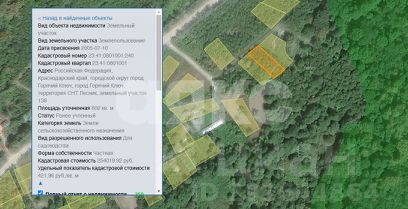 Участок имеет кадастровый номер 23:41:0801001:240 и юридический статус садоводства. Кроме того, земля была приватизирована, что обеспечивает ее полную законность. Есть решение Администрации о присвоении адреса. Расстояние от города составляет всего 15 километров,