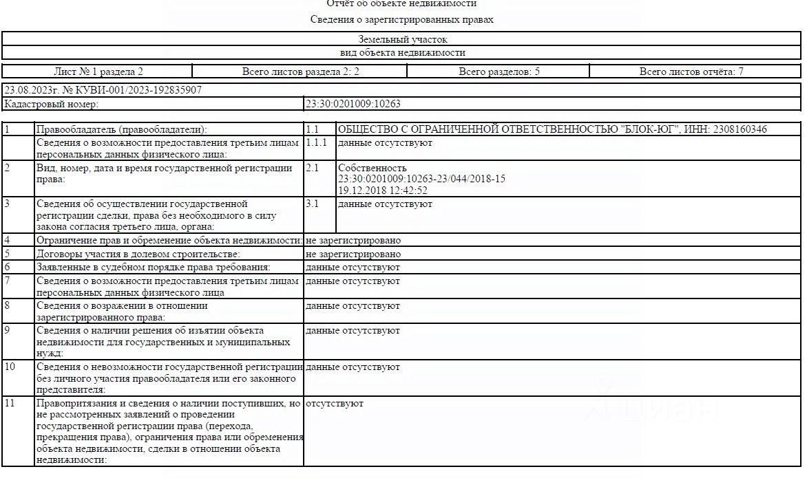 Участок в п. Кучугуры, кадастровый номер 23:30:0201009:10263, категория земель - земли населенных пунктов, вид разрешенного использования - для индивидуального жилищного строительства. Собственник юридическое лицо (в собственности с 2018 года). Участок юридически чист, готов к продаже.