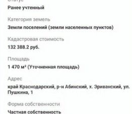 Участок находится в центре станицы. На участке свет. Газ рядом. На участке небольшой домик, без документов.