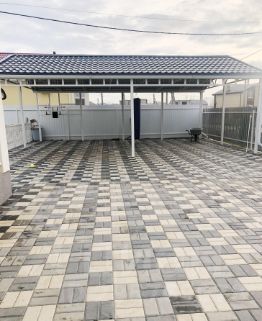 На участке построен капитальный металлокаркассный навес в дизайн дома на 2 авто 50 кВ м. Во дворе и по отмосткам дома брусчатка под дизайн дома.