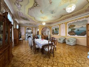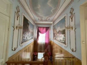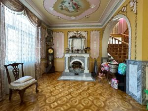 На первом этаже шикарный зал 84,3 м2 с гардеробной, в зале стены разрисованные художниками - картины из Эрмитажа, установлен действующий камин из мрамора, кухня-гостиная 35,7 м2 вся в паркете из натурального дерева, просторный санузел в мраморе 16,7 м2. Дубовая лестница на второй этаж.