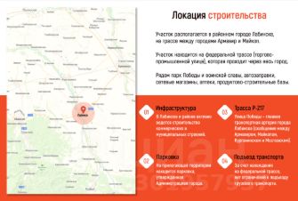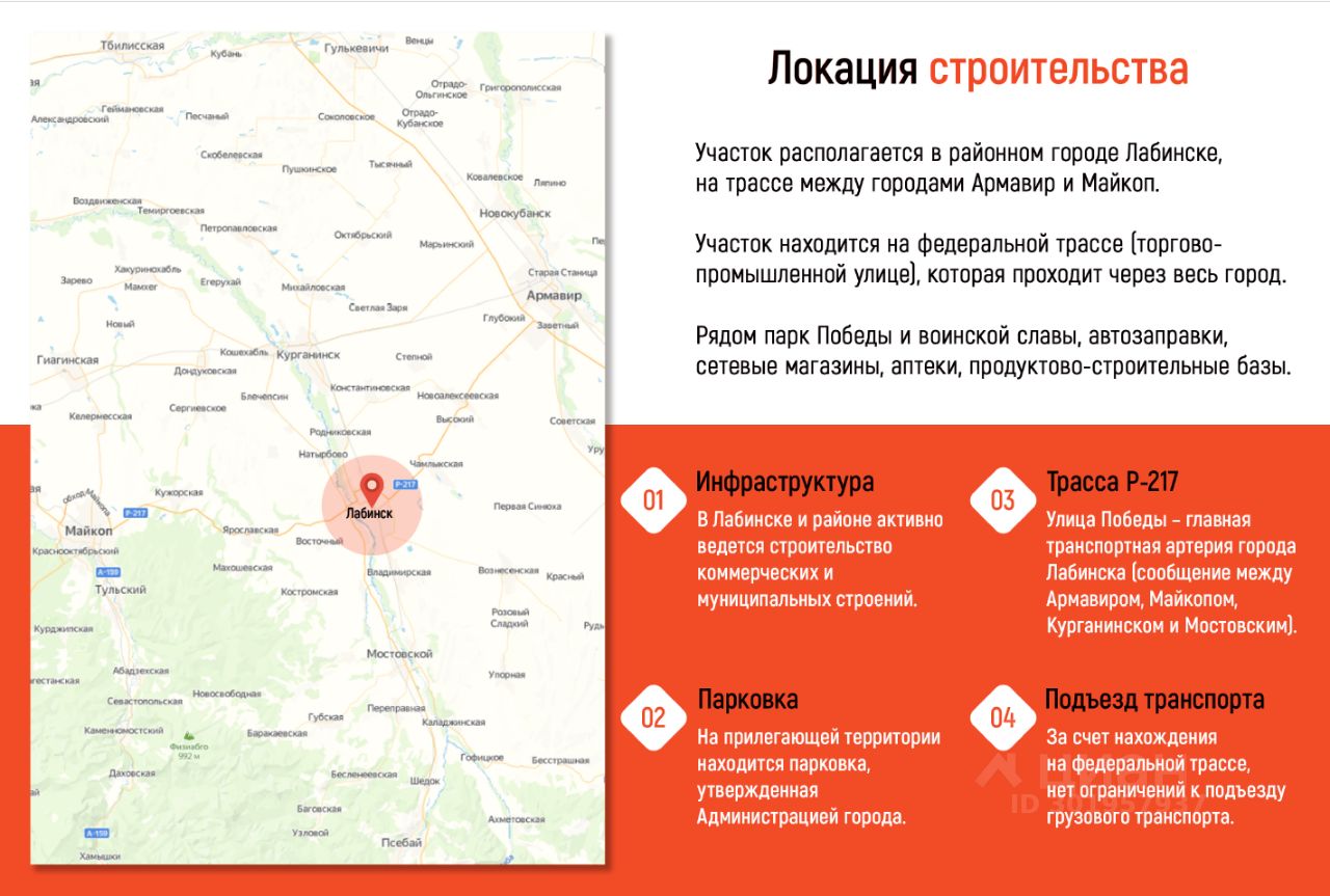 Участок располагается в районном городе Лабинске, на трассе между городами Армавир и Майкоп на федеральной трассе (торгово-промышленной улице), которая проходит через весь город.