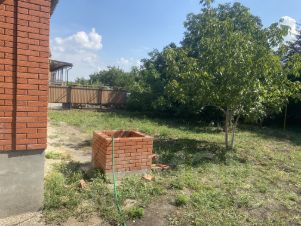 Поднятый участок плодородным грунтом, который благоприятно воздействует на урожайность за счёт обновления чернозема и глубокого орошения. Откатные ворота из двойного евро штакетника.