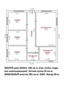 Станица Тбилисская, ул. Октябрьская (спальный район). Жилой дом 2023 года постройки. Общая площадь 106 кв. м. Удобная планировка, современные материалы. Просторная кухня-гостиная 31 кв. м., три изолированные комнаты (15+12,5+12), совмещённый санузел 10,3, коридор 19,8 кв. м. Газ, вода, котёл, все коммуникации. Есть летняя кухня 34 кв. м.: кухня-гостиная, совмещённый санузел, заведены все коммуникации и отопление. Двор бетон, навес. Фасад 30 м. Земельный участок 581 кв. м. под ИЖС.
