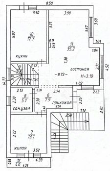 На первом этаже находится большая гостиная площадью-35,2кв.м, где можно принимать гостей или отмечать торжественные события собираясь за вместительным обеденным столом на 8 персон, гостевая комната, совмещенный санузел и просторная кухня-17,7кв.м. с современным функциональным кухонным гарнитуром и встроенной бытовой техникой.