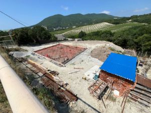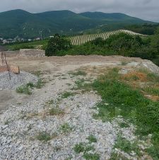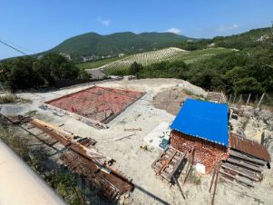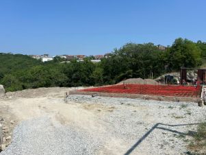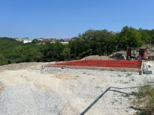 На данный момент монтируется утепленная  жб. плита под дом правельной формы 9х11 и подпорные жб. стены с двух сторон, всё на сваях.
