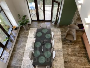 Каждый этаж имеет свой функционал: технический, спортивно оздоровительный комплекс с бассейном, гостевой с кухней и зоной отдыха, этаж для хозяев с кабинетами и мастер спальнями. На крыше дома расположена смотровая площадка с бесподобным панорамным видом на лес, море, степи.