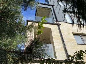 Светло-бежевый фасад здания облицован натуральным камнем, привезенным из Италии и декорирован архитектурной подсветкой, установлены окна с алюминиевым профилем, террасы с прозрачным ограждением.