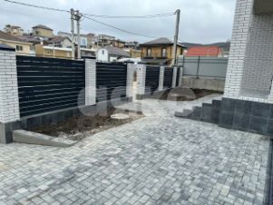 По фасаду массивный кирпичный забор в комбинации с металлическим профилем.