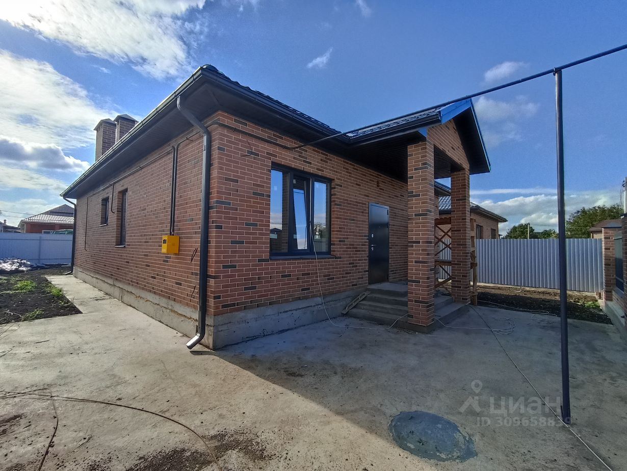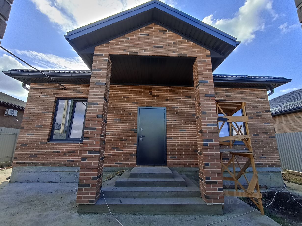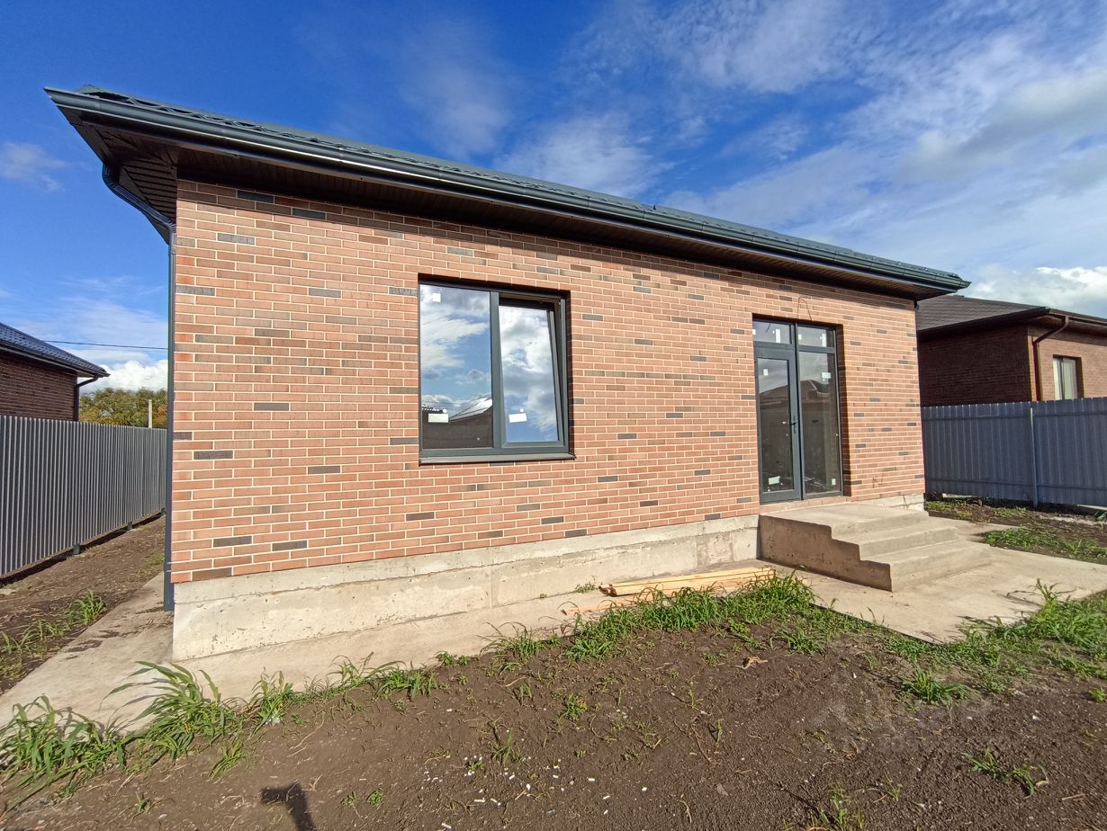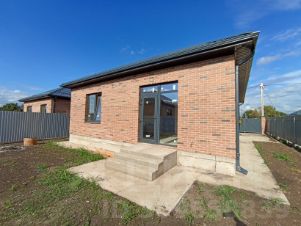 Возведен из отсевного блока и облицовочного кирпича, крыша металлочерепица. Потолки подшиты и утеплены (высота потолков 3 метра). По периметру дома отмостка, по периметру участка забор,с фасадной стороны капитальные кирпичные колонны и профнастил, откатные ворота,на участок завезен чернозем.Внутри участка забетонированная площадка для автомобиля.