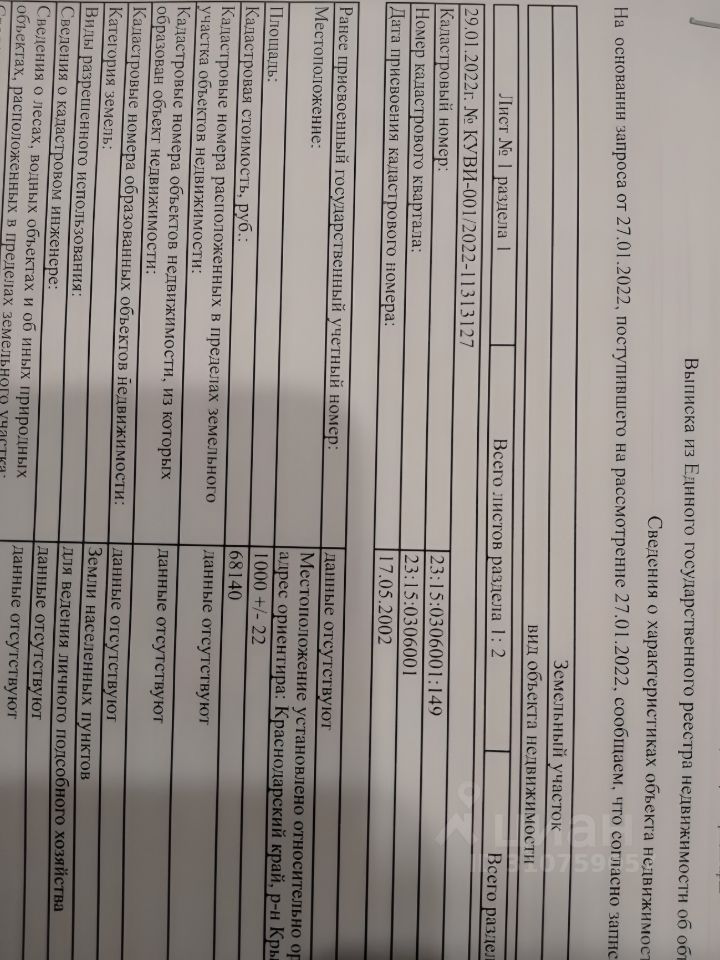 Кадастровый номер участка 23:15:0306001:*** указал продавец