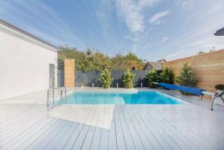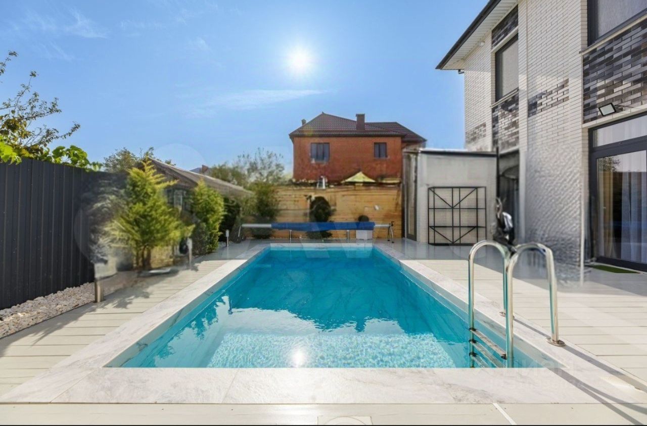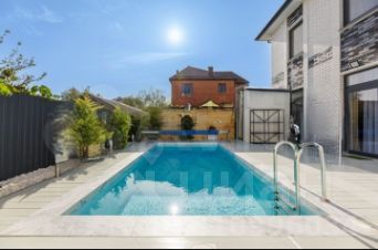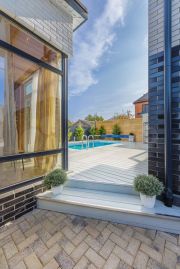 Зеленый газон, Цветники и конечно Шикарный бассейн с подогревом , с деревянной сауной. Есть закрытый гараж на 2 автомобиля с электрическими воротами. На втором этаже гаража расположена гостевая квартира.