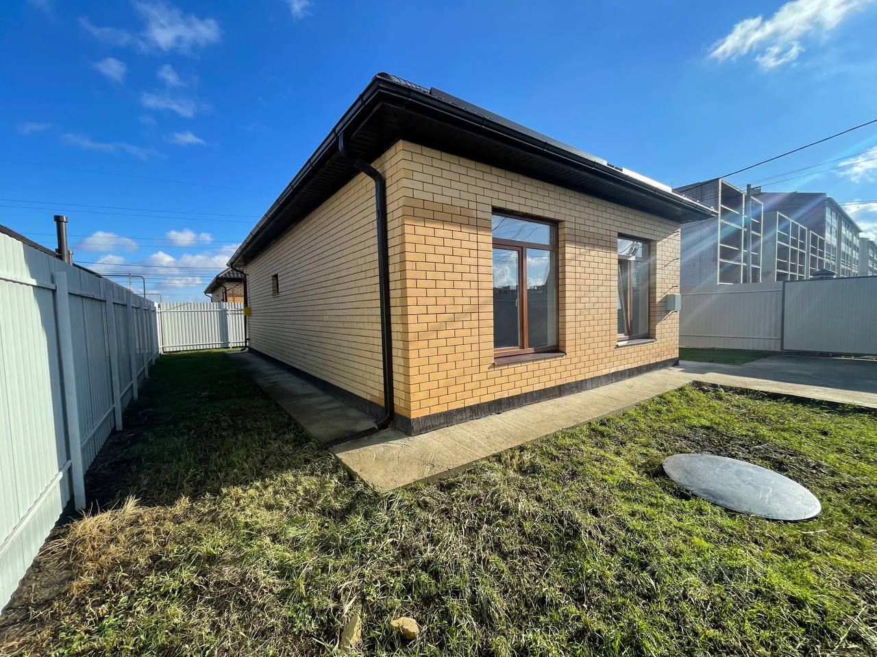 Участок правильной прямоугольной формы, с большой территорией заднего двора за счет правильного расположения дома. Откатные ворота. По периметру дома сделана отмостка.