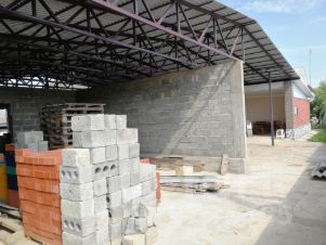Рядом высокое капитальное здание 64м2 гараж на 2 машины и мастерская, или еще один дом . Оба здания соединены металлическим навесом.