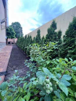 Красивая аллея из взрослых туй расположена по периметру всего забора. Выложены дорожки из дорогой брусчатки и плитки, установлено уличное освещение.