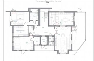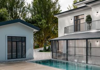 1 этаж: просторная кухня и гостиная с панорамными окнами, из которых открывается вид на лес, и выход на уютную террасу с бассейном, мастер-спальня с с/у, гладильная с окнами, с/у гостевой