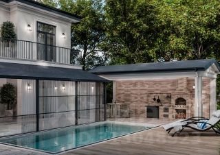 По проекту на территории залит глубокий монолитный бассейн и баня на дровах.