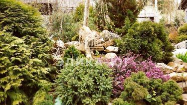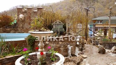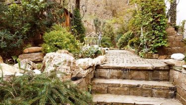 Так как домовладение находится у подножия небольшой горы на возвышенности, дизайн ландшафта левой части внутреннего двора( входная зона) представляет собой пейзажный стиль с разнообразными миксбордерами из хвойных вечнозелёных и буйства сезонных цветущих растений. Здесь же протекает живой ручей, обрамлённый в живописную мозаику из камня. В многообразии зелени утопает уютная беседка.