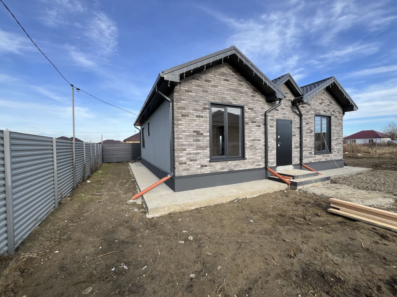 Участок огорожен по периметру забором, откатные ворота, калитка, двор забетонирован, отмостка — по периметру дома, дорожки к дому, место под клумбы, парковочные места.
