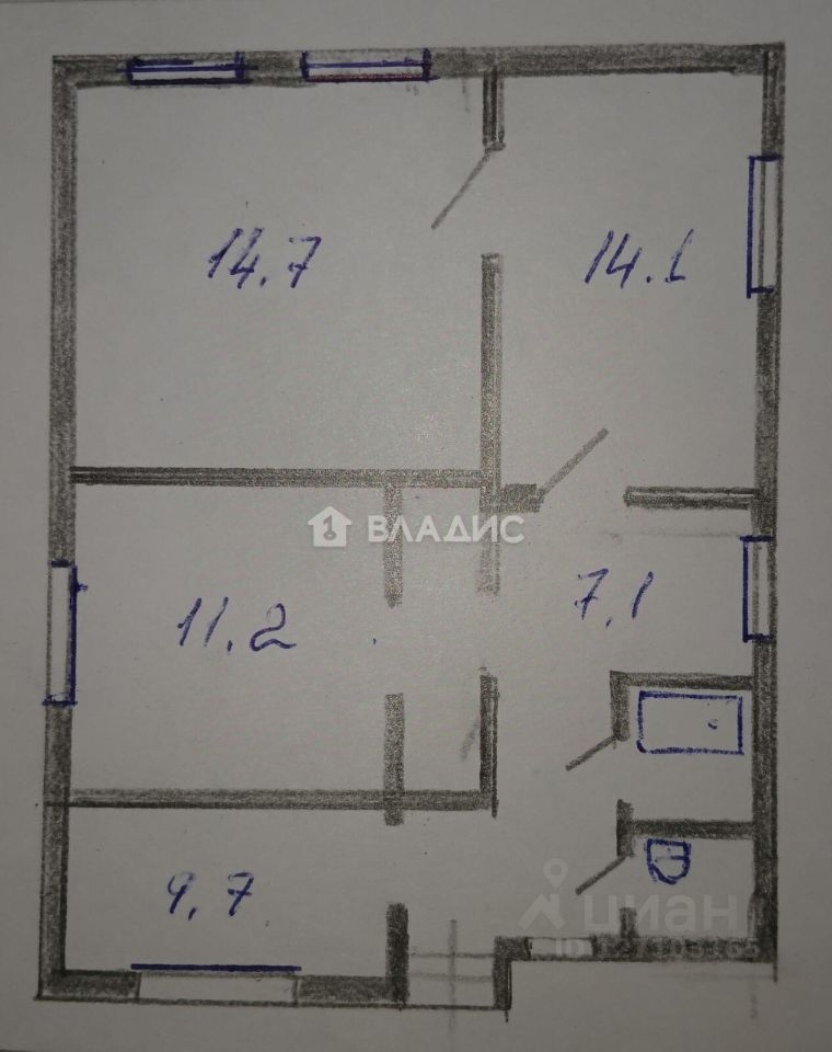 Общая площадь 65 м2., кухня - 9.7 м2, раздельный санузел.