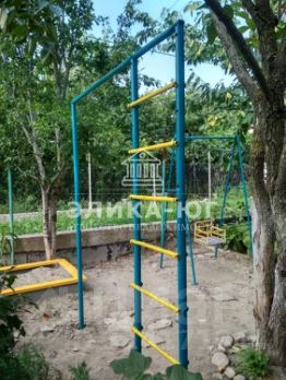 мангальная зона под навесом.т, зона отдыха с детской площадкой. На участке растет сад с плодовыми