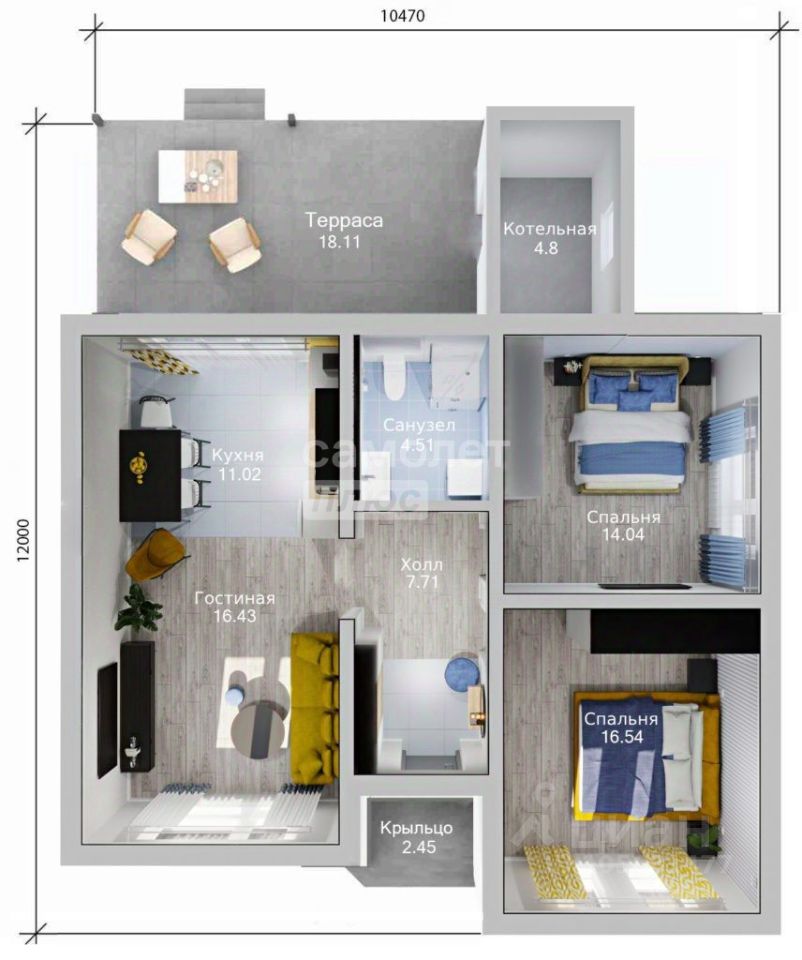 Площадь: 93,0 м2. В доме две спальни, просторная гостиная, соединенная с кухней и выходом на террасу, совмещенный санузел, котельная, прихожая. Все помещения расположены с учетом назначения помещений и комфортного функционирования пространства дома.
