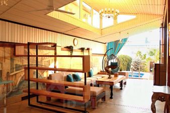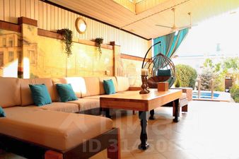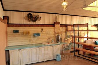 На террасе установлены вентиляторы, уличная мебель, кухонная зона.