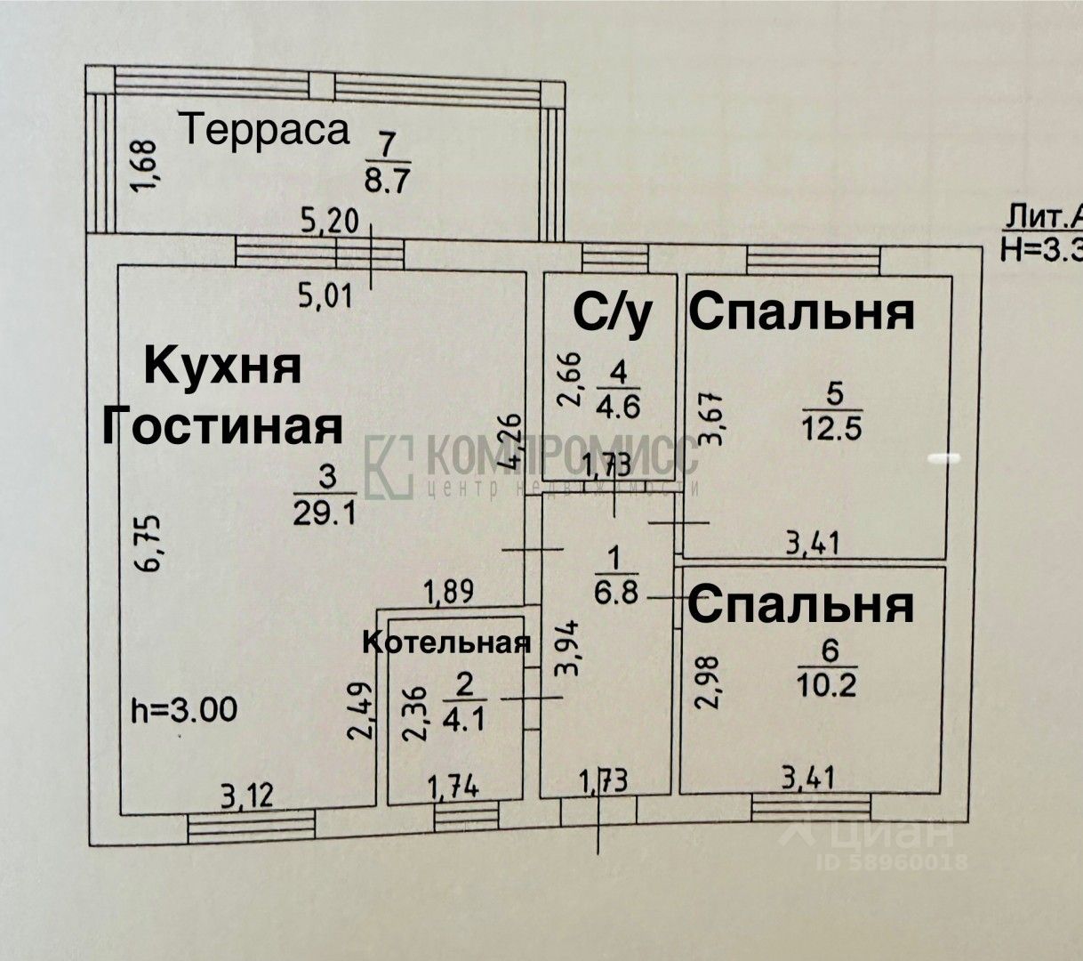 В доме две изолированные жилые комнаты (10 и 12,5 кв.м.), кухня-гостинная (29 кв.м.), коридор, просторный санузел с душевой, котельная (4,1 кв.); остекленная и утепленная терраса (8,7 м²).