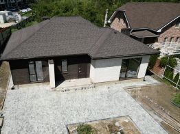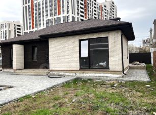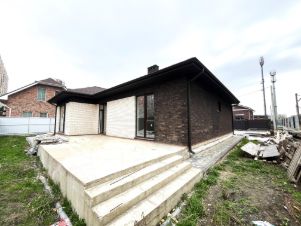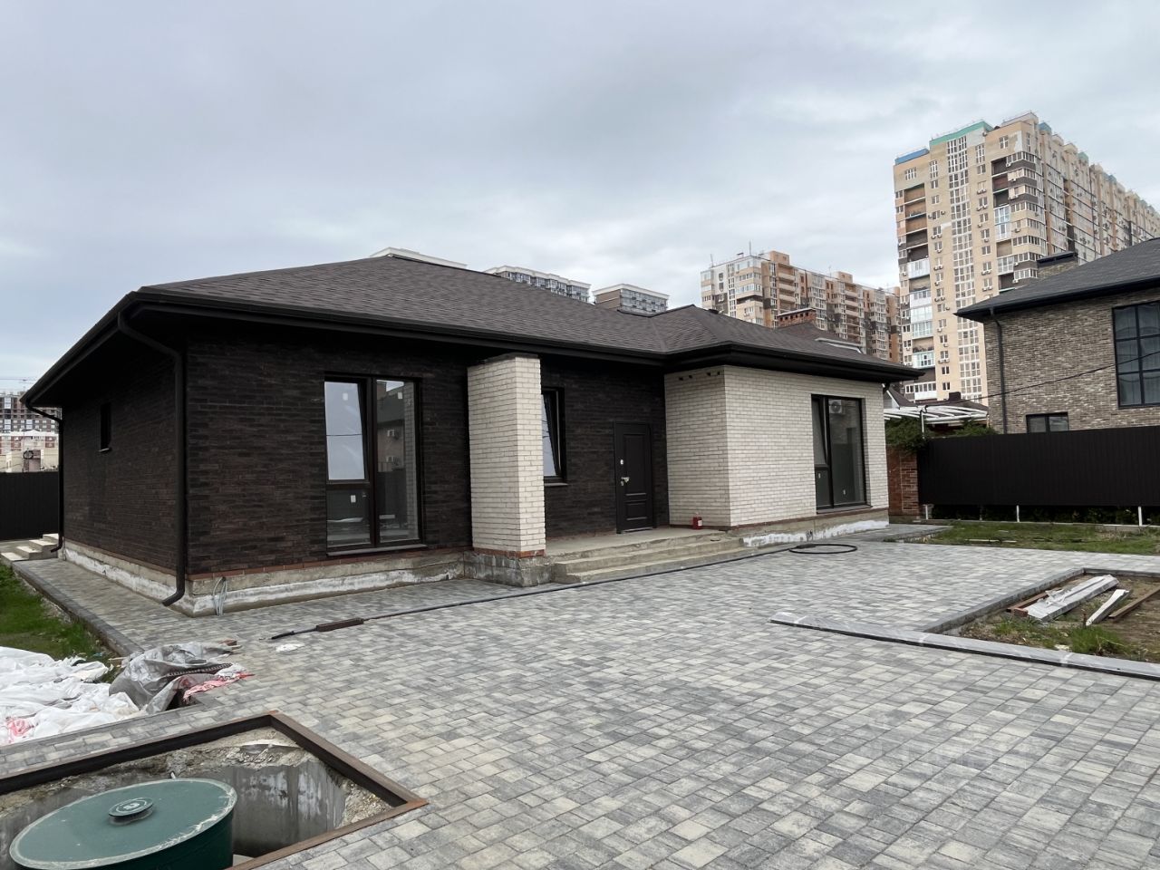 Одноэтажный коттедж возведен в современном архитектурном стиле по индивидуальному проекту использованием качественных строительных материалов: ленточный фундамент, стены — кирпич Паромакс, наружные стены — комбинированный кирпич ручной формовки, большие в пол металлопластиковые окна с внешней ламинацией, кровля — гибкая черепица.
