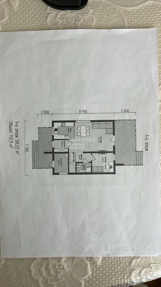 первый этаж: прихожая, гардеробная с окном и выходом на террасу (при необходимости можно переоборудовать под спальню), сан.узел. просторная кухня -гостиная с выходом на террасу (терраса остеклена), на террасе расположена котельная в которой установлен котел отопления , система очистки воды.