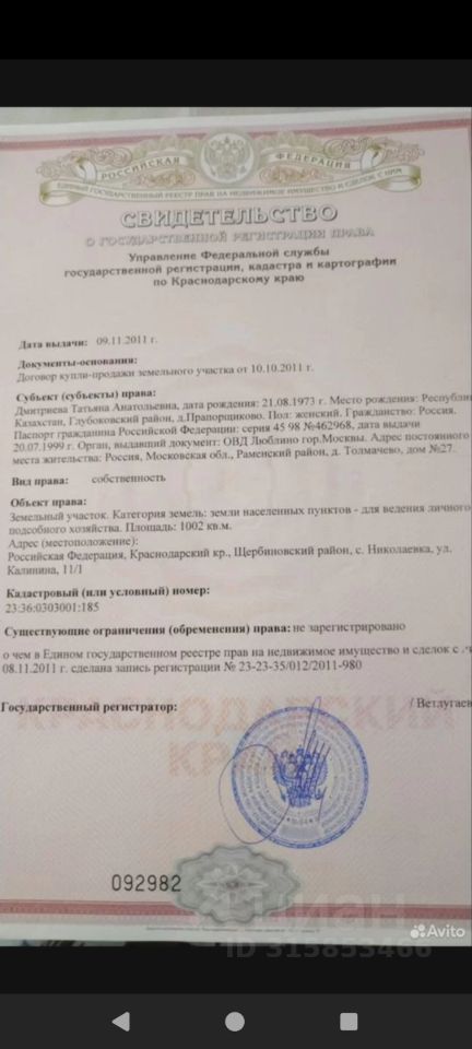 Продается земельный участок площадью 10 соток, расположен по адресу: Краснодарский край, Щербиновский район, село Николаевка, ул. Калинина, 11/1.