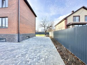 По периметру участка — забор из профнастила, фасадная часть — штакетник с кирпичными колоннами и откатные ворота.
