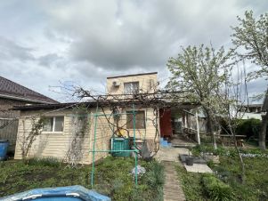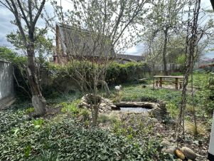Уютный, ухоженный участок, утопающий в цветах. Растет множество южных плодовых деревьев — персик, слива, яблони, сливы, виноград.