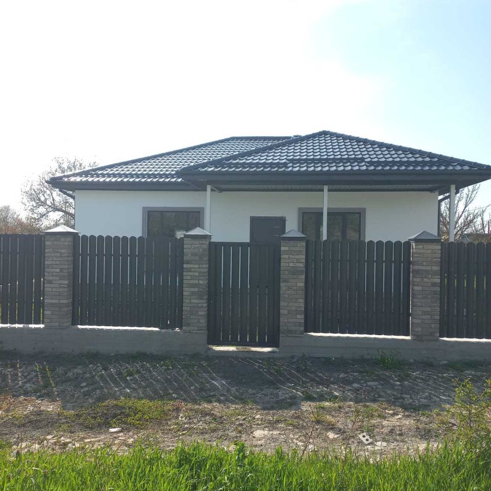 Установлен забор (из евроштакета и профнастила с кирпичными колоннами).