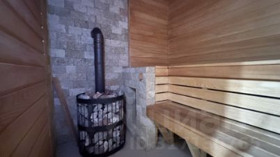 Площадь 40 м², включает парилку, санузел и комнату отдыха с кухней и камином. Отделка выполнена из бука под красное дерево; также есть подвал площадью 15 м².
