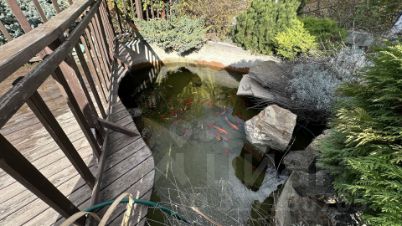 Дом расположен на склоне горы и окружен лесом с двух сторон. Участок идеально ровный, с подпорной стеной и перепадом высот от 2 до 5 метров (толщина стены 40-60 см). На территории выполнено озеленение с автоматическим капельным поливом, установлен декоративный пруд с карпами Коя, а также детская площадка с качелями и резиновым покрытием. На участке расположены: жилой дом, гараж, баня и летняя беседка.