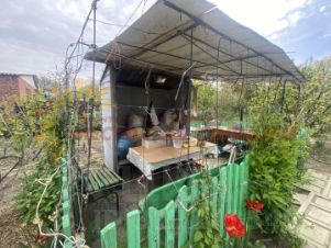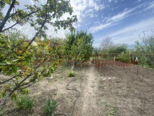 На участке плодоносящий сад: алыча, малина, клубника, черешня, слива, яблоня, вишня, груша, смородина, виноград. Также есть навес, гараж с ямой, въезд для авто, беседка, скважина, хозпостройки. Двор в плитке, цветник.