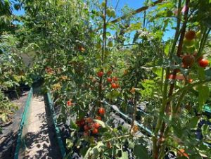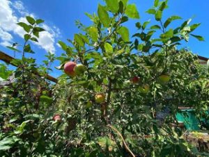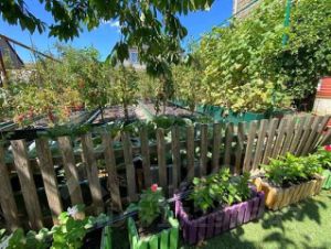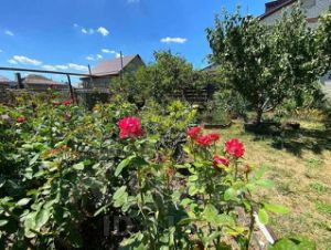 Уютный участок с площадкой для отдыха, где растут различные деревья: черешня (2 сорта), яблоня (3 сорта), груша, персик (2 сорта), чернослив, абрикос, гранат, виноград, а также малина, клубника, ежевика, розы и пионы.