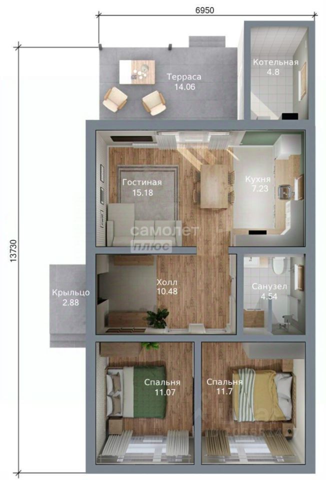 Площадь: 82,0 м2. В доме две спальни, просторная гостиная, соединенная с кухней, с выходом на террасу, совмещенный санузел, котельная, прихожая. Все помещения расположены с учетом назначения помещений и комфортного функционирования пространства дома.