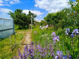 Весь задний двор утопает в цветах и зелени: насажены многочисленные виды розы, ирисов, пион и других цветов, есть небольшой прудик, высажены несколько плодовых деревьев - яблони, груши, алыча, кизил, черешня, вишня и прочее, а также несколько видов винограда. Практически по всему огороду проведен автоматический капельный полив. В весеннее и летнее время года двор настолько красив, что его просто не хочется покидать ни на секунду.