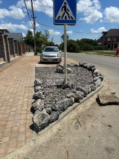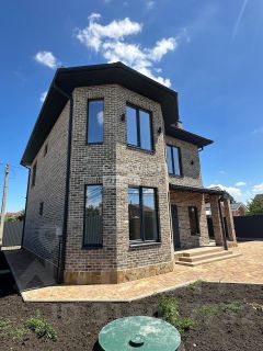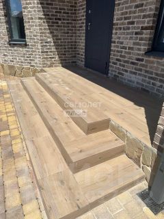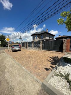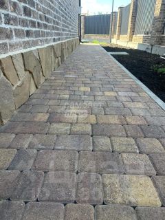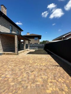 Во дворе все выложено брусчаткой и плиткой. Есть навес под веранду. Забор евроштакетник.