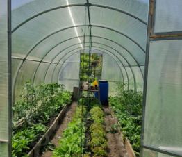 На земельном участке размещены: блочный гараж, погреб, теплица, летняя кирпичная кухня ( используется как жилое помещение) с автономным отоплением, электричеством и центральным водопроводом, санузел на улице.