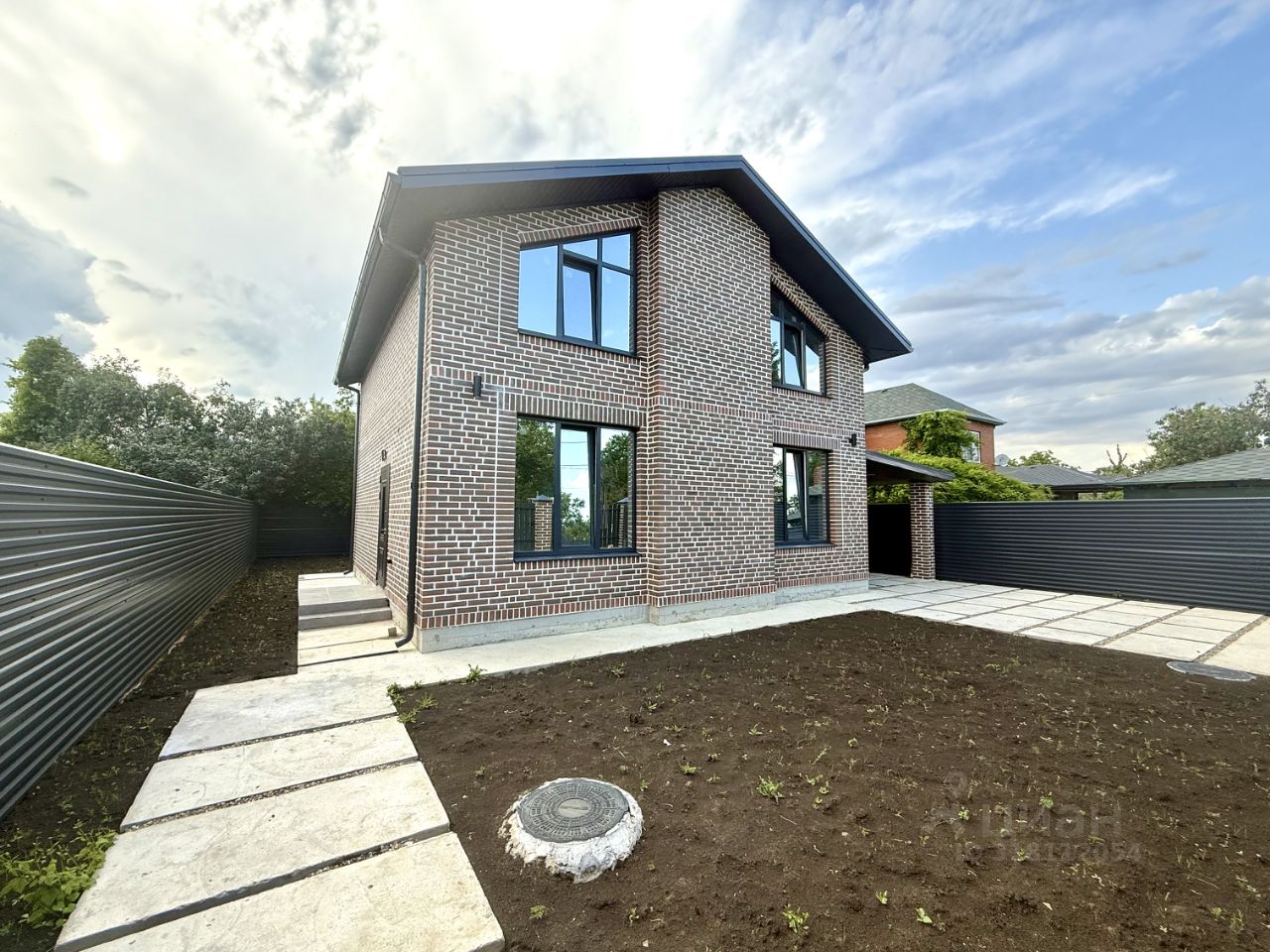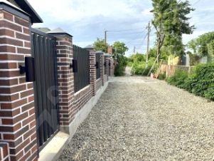 Дом расположен на 4 сотках земли, назначения СНТ, участок огорожен по периметру забором, с фасадной стороны — кирпичные колонны, евроштакетник, откатные ворота, калитка, фасадная подсветка забора и самого дома.