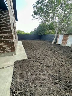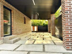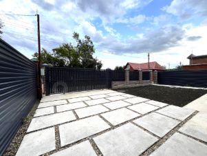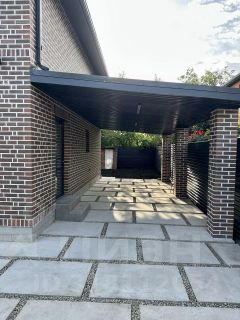 Двор — печатный бетон, парковочные места для автомобилей под большим навесом, можно разбить на заднем дворе зону барбекю, высадить кустарники, обустроить клумбы и палисадник.