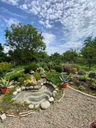На заднем дворе шикарный сад с ландшафтным дизайном, в центре которого расположен пруд с мини водопадом, а вид на это все нам открывается с террасы с задней части дома.