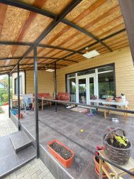 На переднем дворе залиты столбы под будущий навес, есть доп.постройка используемая как хранилище для садового инструмента, но помещение изначально планировалось как жилое, при желании можно обустроить.