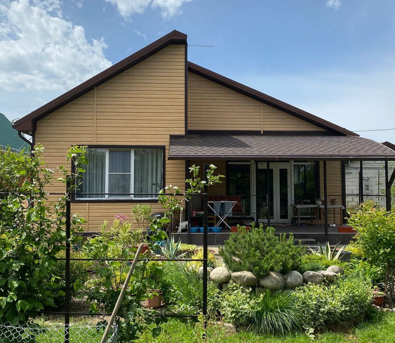 Ухоженная преддомовая территория, широкий фасад. Откатные ворота.