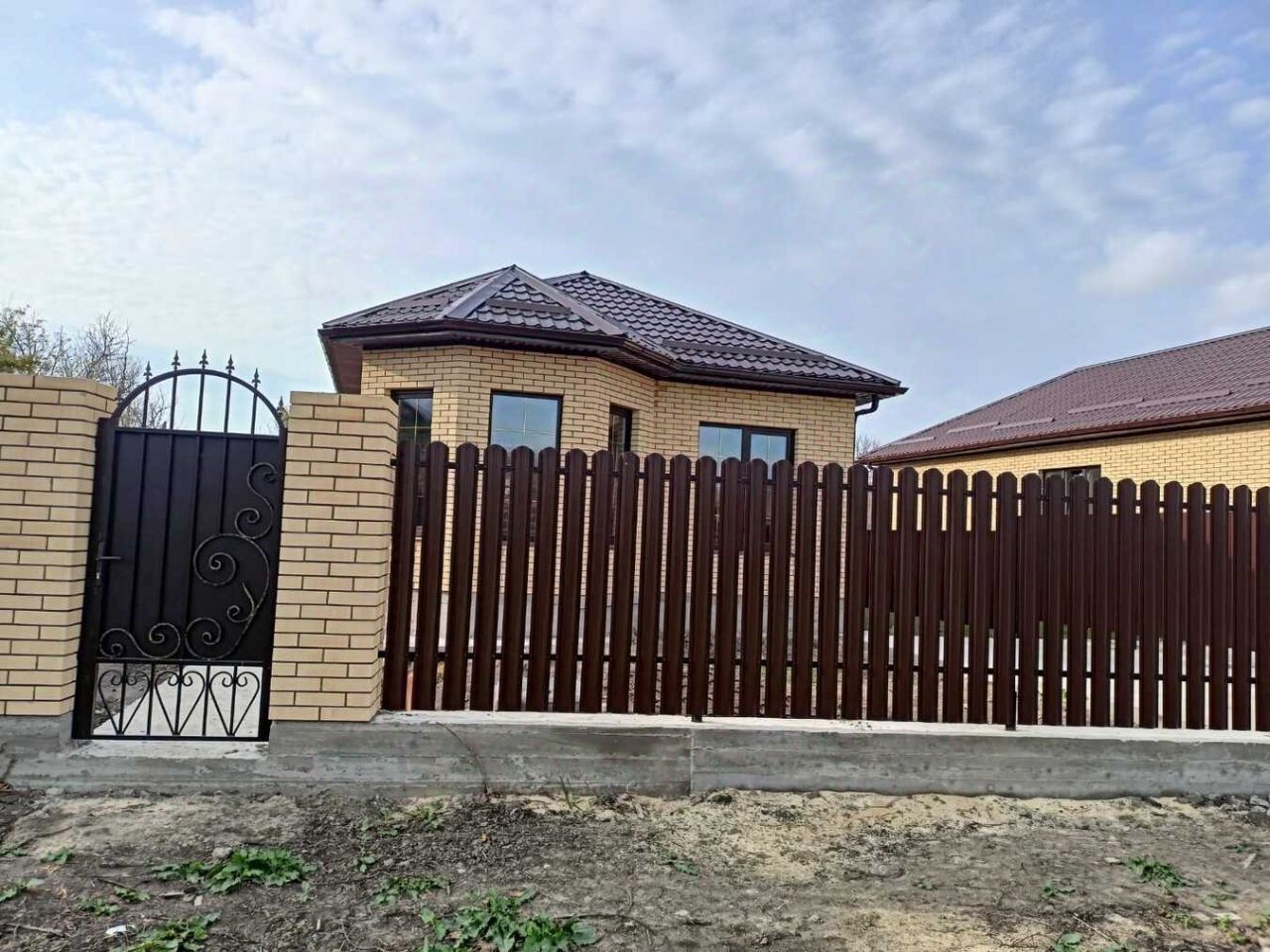 Участок полностью огорожен по периметру, фасадный забор с кирпичными колоннами эстетика и безопасность.