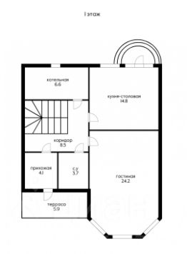 Первый этаж включает кухню-столовую, просторную гостиную с двумя эркерными окнами, санузел, гардеробную и котельную. Второй этаж состоит из трёх спален, санузла и гардеробной.