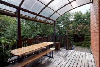 На участке выполнен ландшафтный дизайн с множеством декоративных и фруктовых кустарников и деревьев.